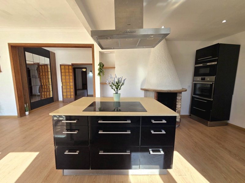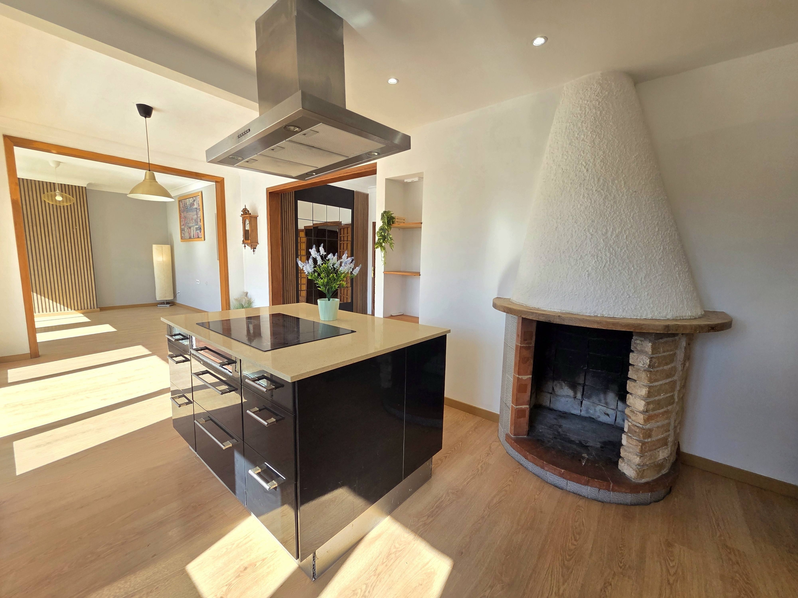 Dispone de un luminoso y amplio salón con zona de comedor y cocina de concepto abierto, equipada, con isla central y chimenea, creando un espacio moderno y confortable. Desde el salón se accede a dos terrazas, ideales para disfrutar del exterior.