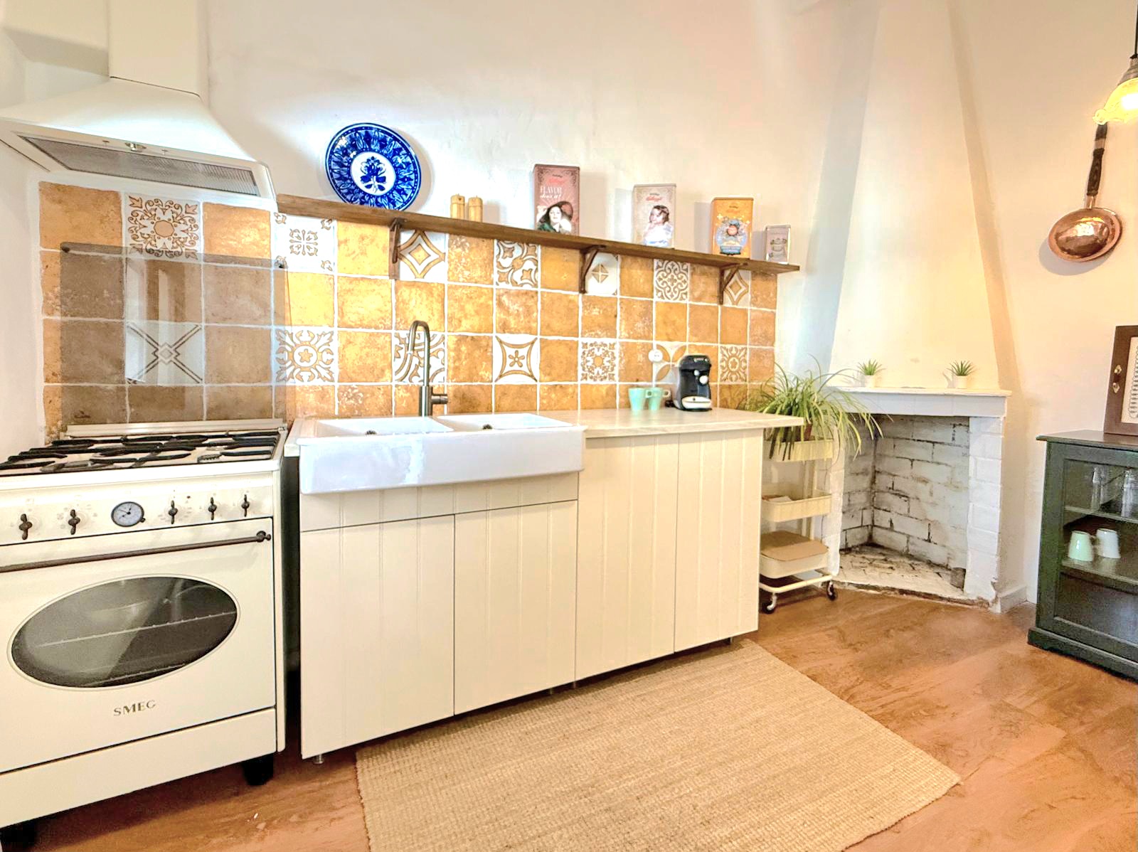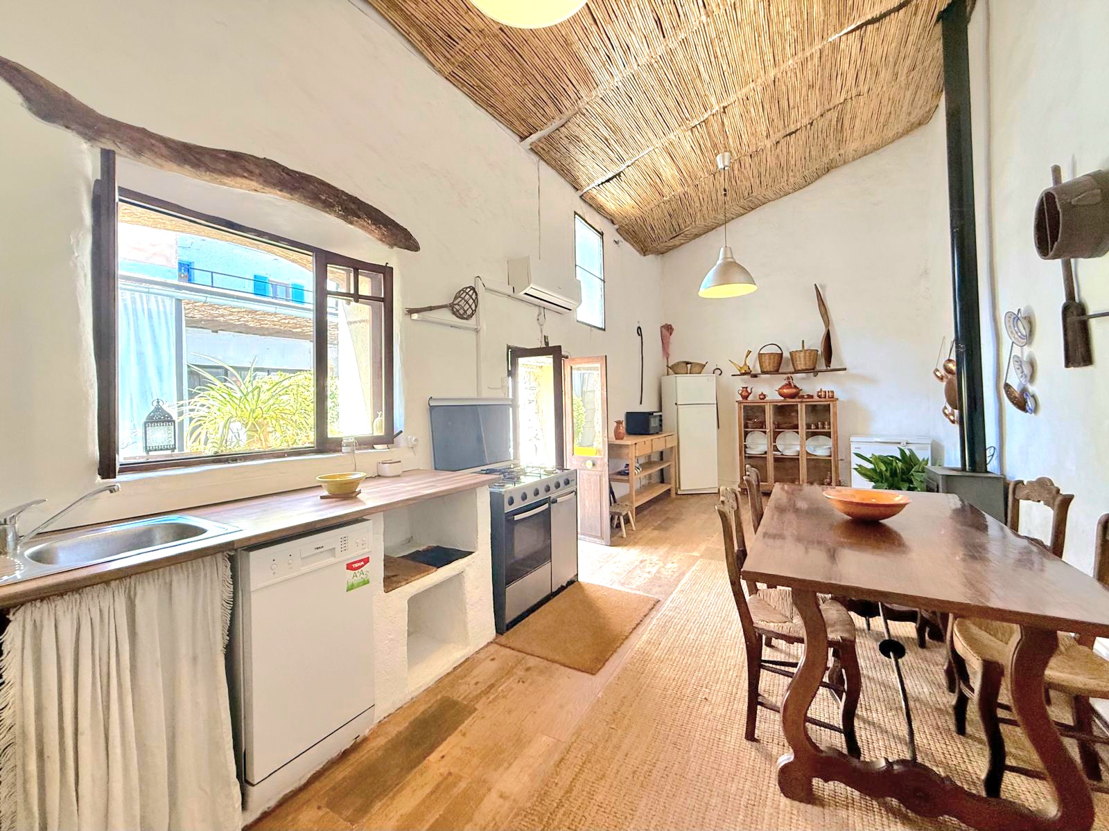Al otro lado del patio se encuentra la cocina-comedor mallorquina, bien decorada y que conserva todos los detalles típicos, equipada con chimenea y aire acondicionado, junto con un pequeño trastero-lavandería.