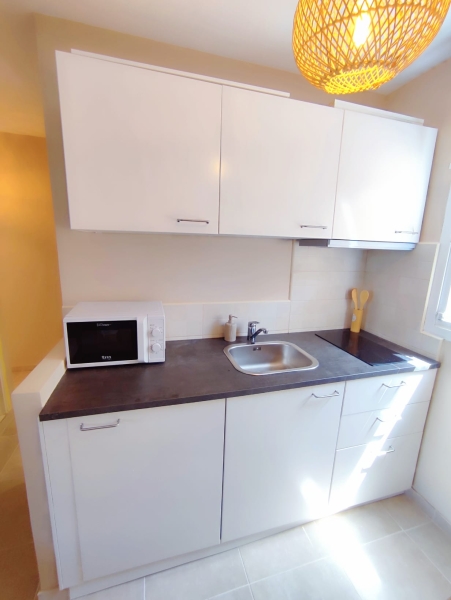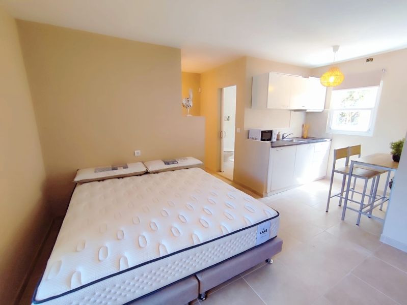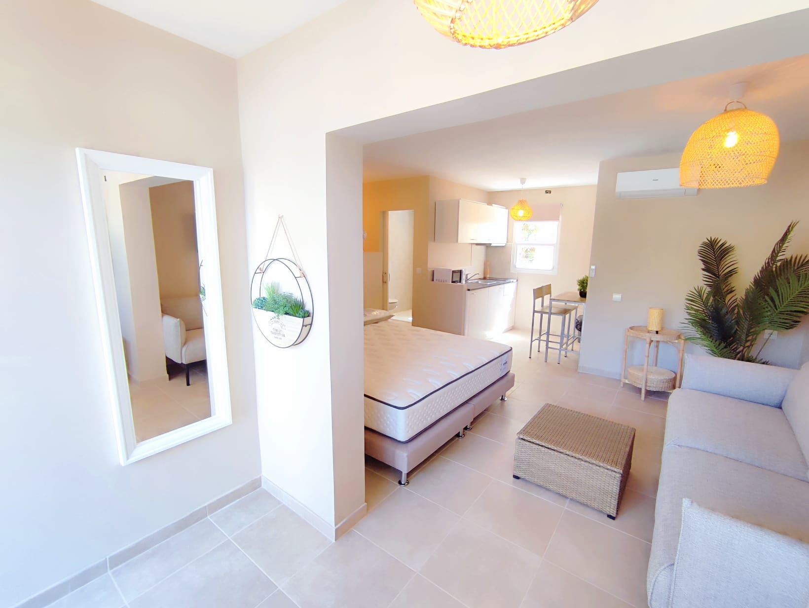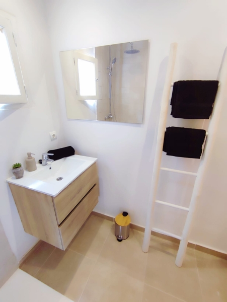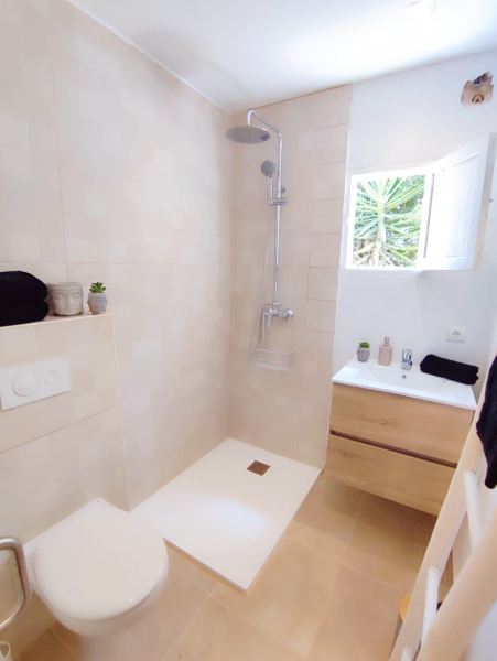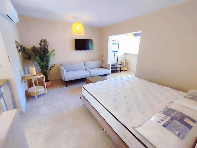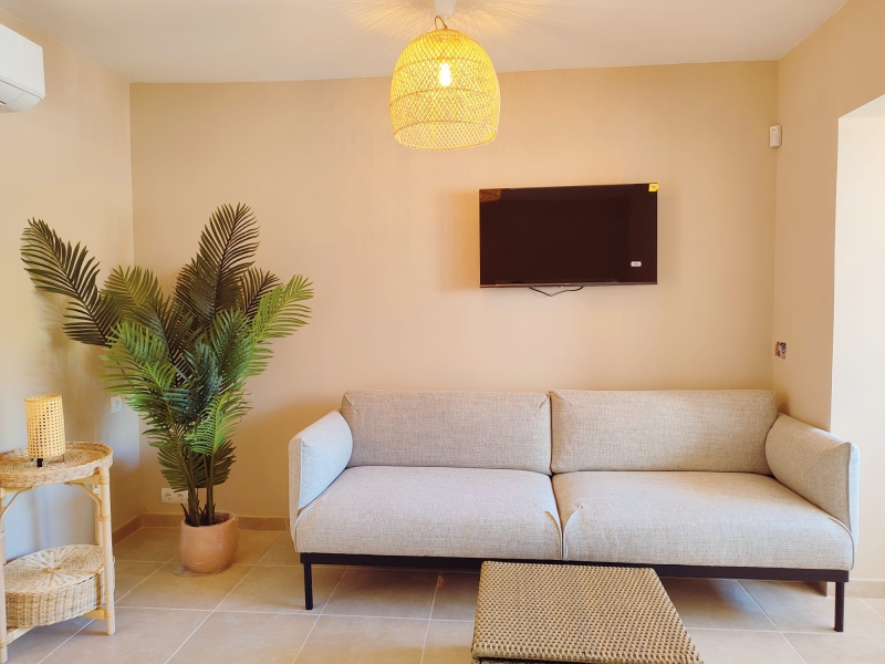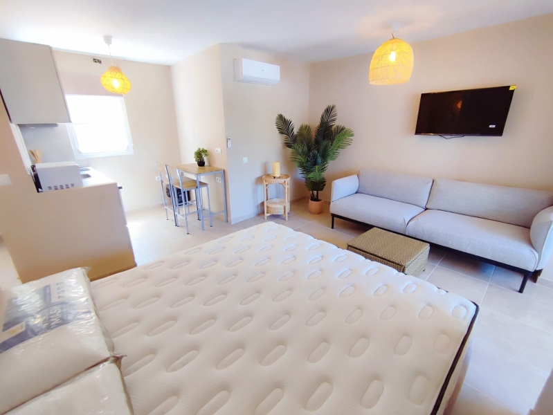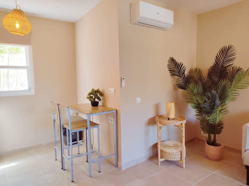 Reformado hace dos años, cuenta con 34 m² distribuidos con gran funcionalidad y un diseño moderno. Además, en el exterior cuenta con una terraza privada y pérgola cubierta, un espacio perfecto para leer, desayunar al aire libre o disfrutar de momentos tranquilos durante todo el año. Al acceder, un pequeño recibidor da paso a una luminosa zona de estar que integra una cama doble, creando un espacio cálido y confortable ideal para desconectar.